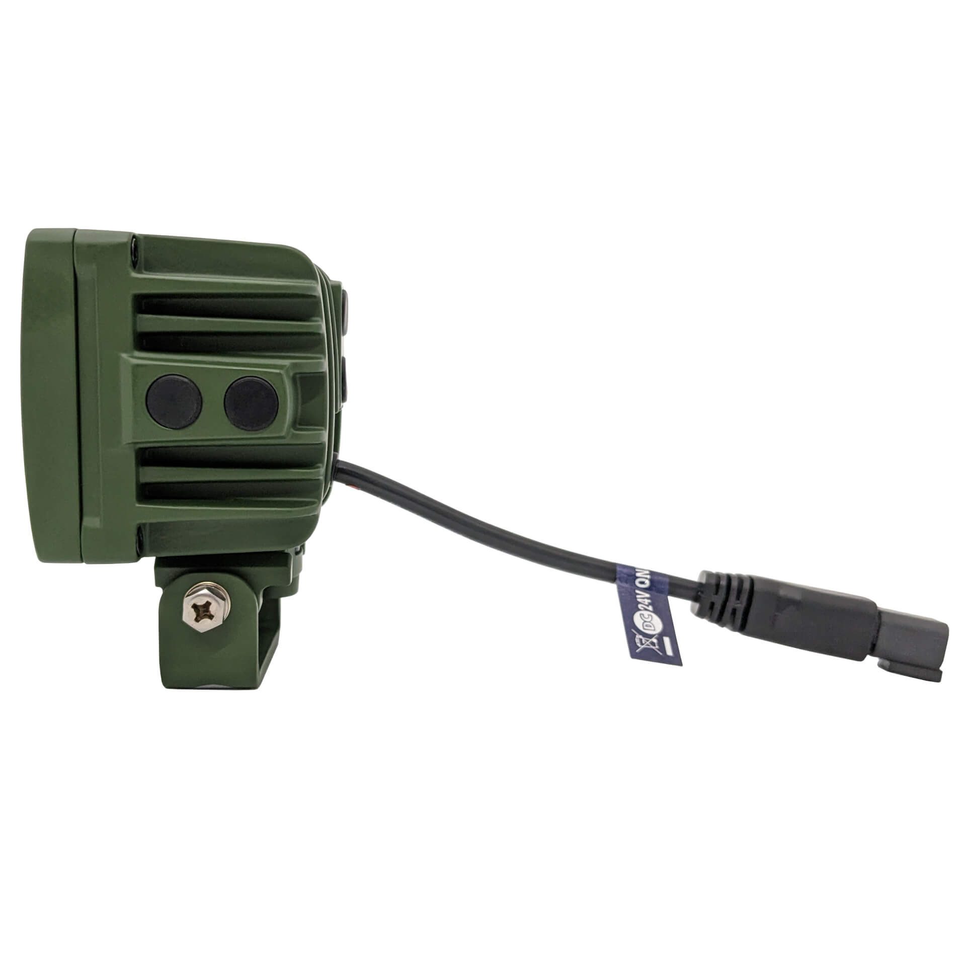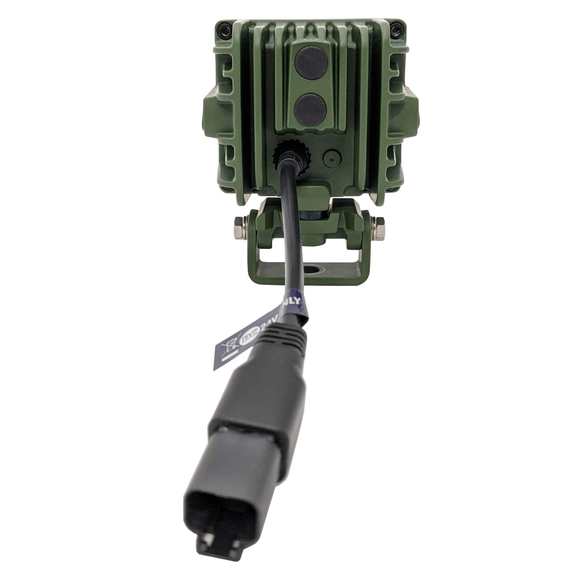 Denna lampa uppfyller MIL-STD-461. Kan enbart användas med 24V. Lamphus och hållare är lackade i en tålig mörk/militär grön färg och lampan har en svart bakgrund, för ett mer diskret utseende.