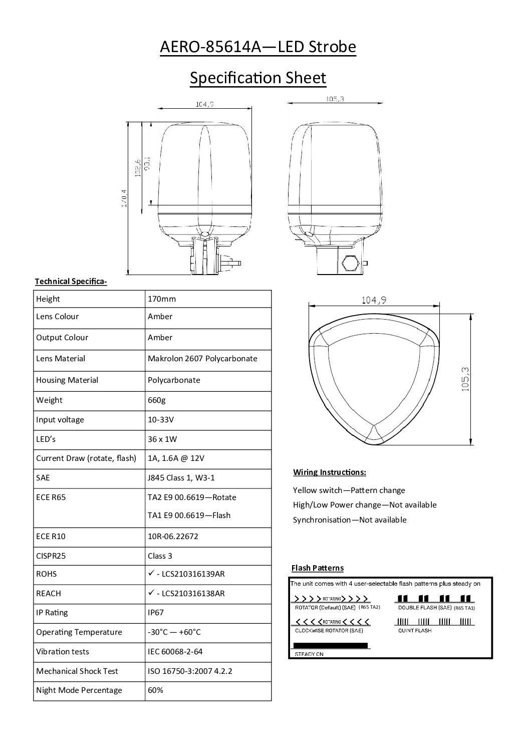 Märkning: ECE R65 Class 2, CISPR 25 Class 3, SAE Class 1