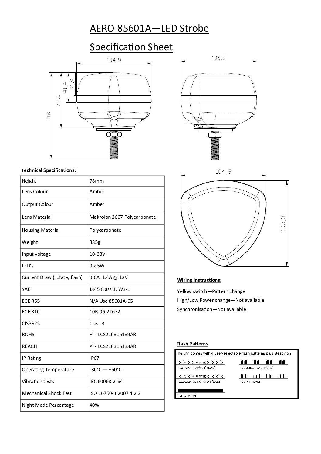 Märkning: ECE R65 Class 2, CISPR 25 Class 3, SAE Class 1